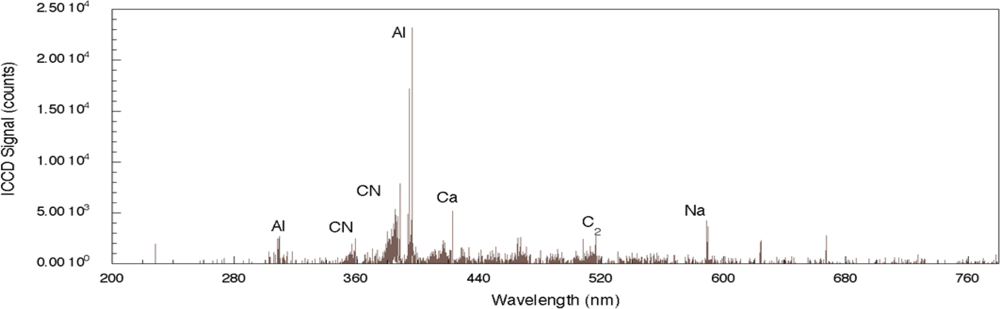 Femtosecond LIBS signal obtained from TNT on an aluminum substrate over the complete detection wavelength range. Elemental emission from the substrate and contaminants are present along with emission from CN and C2.