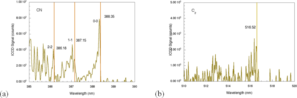 Higher resolution spectra of selected regions of the spectrum obtained for femtosecond excitation of TNT on aluminum. (a) Expanded view of emission from CN. (b) Expanded view of emission from C2. The detection gate delay and width were 100 ns and 1 μs, respectively.