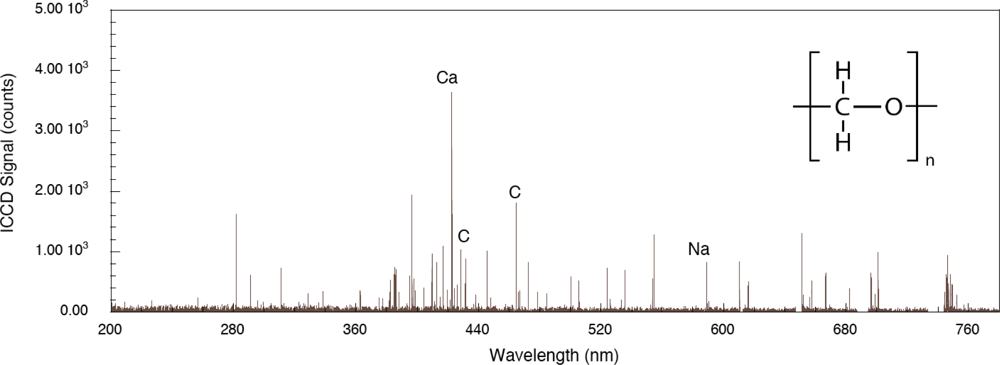 Femtosecond LIBS spectrum of polyoxymethylene (Delrin®) loaded with a carbon filler.