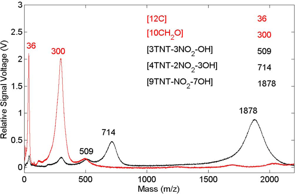 Femtosecond laser excited time-of-flight mass spectrum of polyoxymethylene (light) and of TNT on polyoxymethylene (dark).