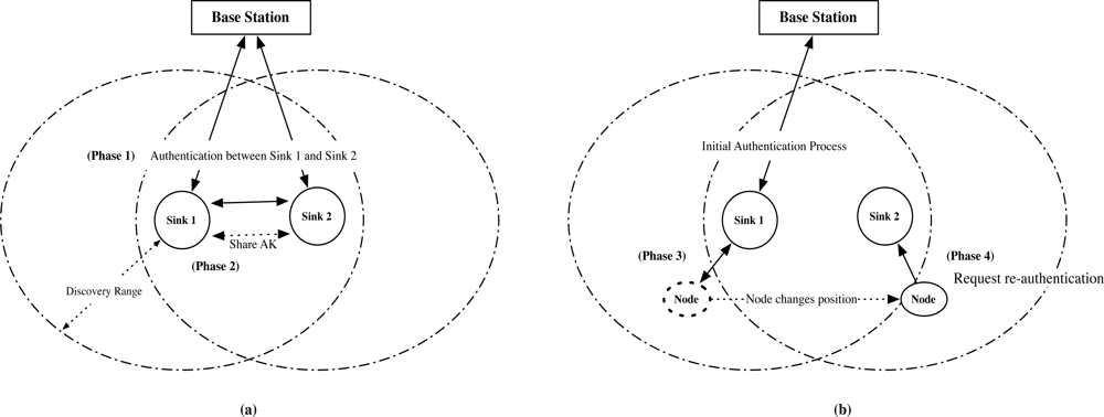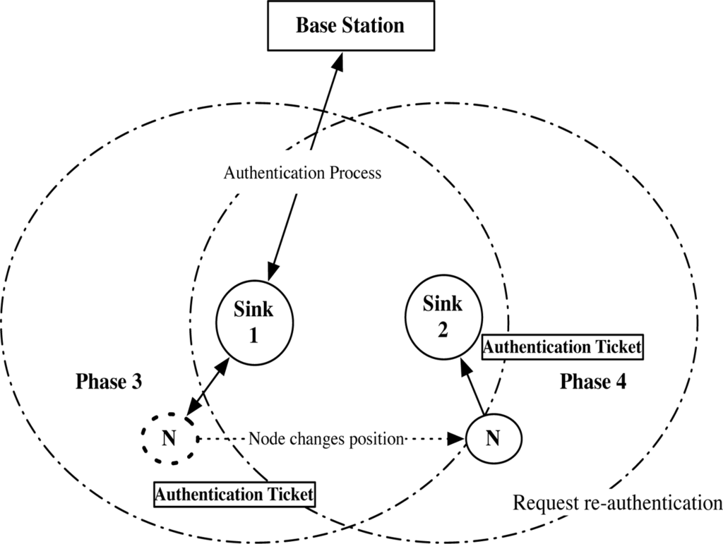 Phase 3: Node requests initial authentication to Sink 1. Phase 4: Node requests re-authentication to Sink 2