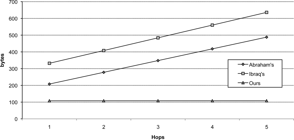 Tables 3 and 4 show the message sizes in the initial authentication and the message sizes in re-authentication with 2 hops between sink and base station, respectively. Table 3 shows that the performance for the initial authentication is similar to other protocols. In initial authentication (Phase 3), Abraham and Ramanatha’s model [6] showed the best result—30 bytes less in message sizes than our protocol. However, as Table 4 shows, our protocol achieves about a third overall message size than other protocols. Even when we increase the size of each parameter, our protocol is still much more efficient than any other protocols in node re-authentication.