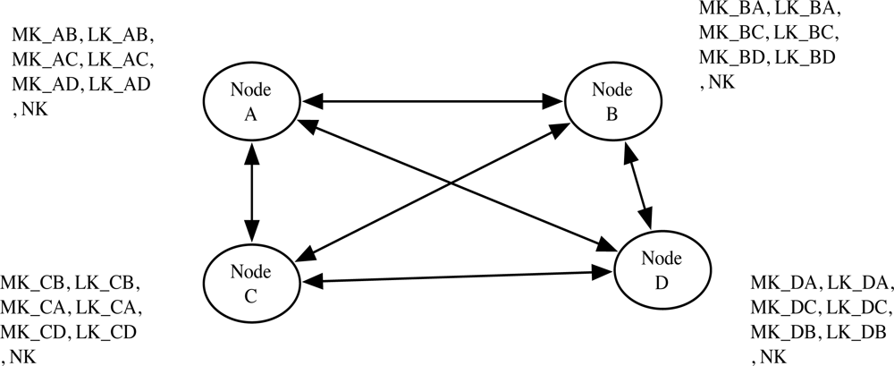 Commercially deployed Zigbee [1] specifies the key agreement architecture that pre-distribute keys. In their architecture, each node pre-installs their unique keys, such as the master key (MK) and the link key (LK), that are shared to other entities and the network key (NK) is shared to entire network by the manufacturer. In order to support node mobility using the unique key, each node has to contain the key as well as the number of nodes. Figure 2 shows the required keys in Zigbee. Seven keys (three MKs, three LKs, and a NK) were required for the secure communication in the network with only four nodes. Thus, deploying Zigbee in the large scale networks requires quite large storage for the key management.
