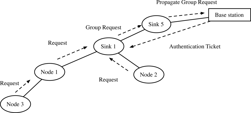 Ibriq and Mahgoub’ model [7]: The intermediate Sink 1 stores the partial key escrow table that stores the partial information of nodes. After the requests from nodes are received, Sink 1 request the authentication ticket to the base station. After receiving the ticket, Sink 1 authenticates and share keys with nodes.