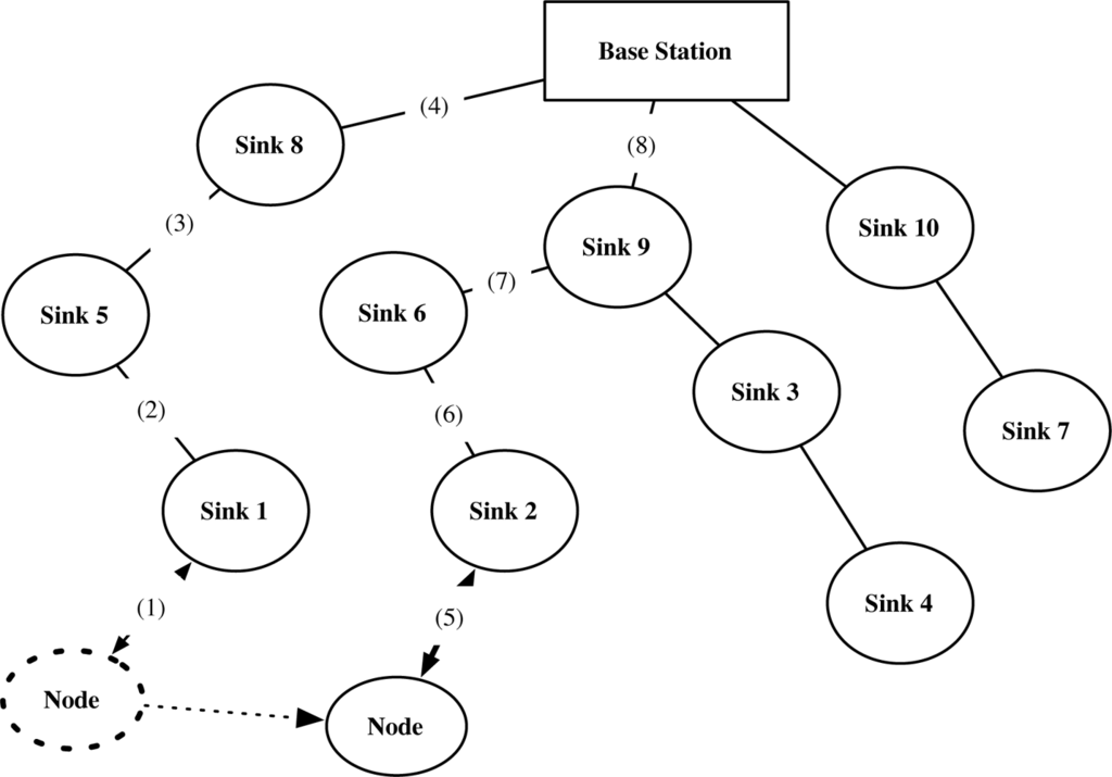 A dynamic mobile node continuously moves in the sensor networks that the static sinks established. The unbroken line denotes the static connection between sinks and the base station. The dotted line denotes the movement of the mobile node.