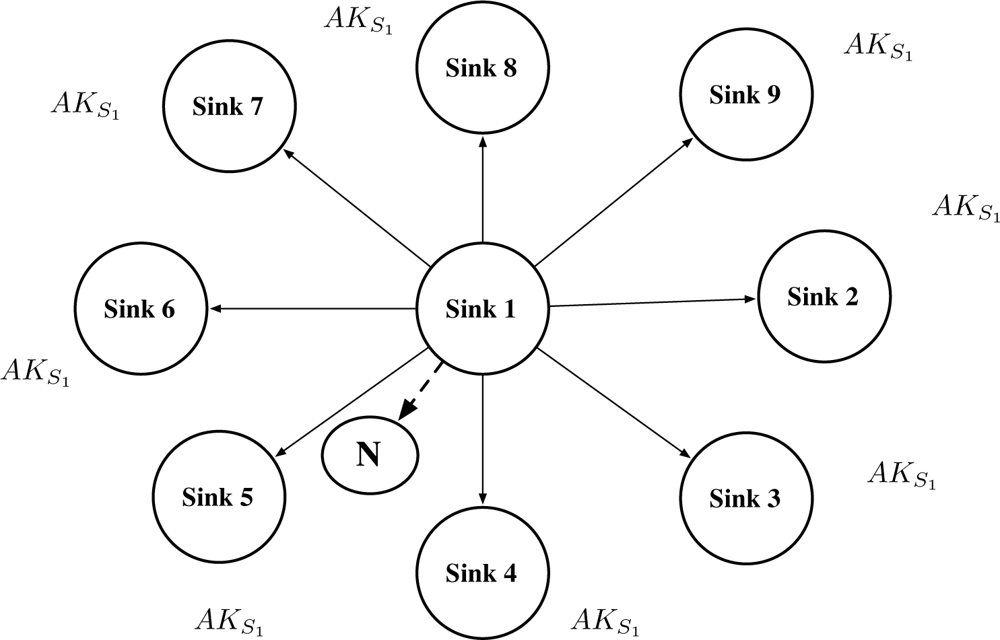 We can define two kinds of threat of sink capture: the sink missing case and the compromised sink case. When a sink S1 is just missing, the node will lose the connection S1 and find other sink such as S2. Thus, we only need to consider the compromised sink case.
