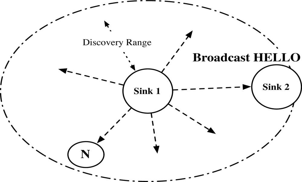 Neighbor discovery (Phase 0): sink periodically broadcasts HELLO.
