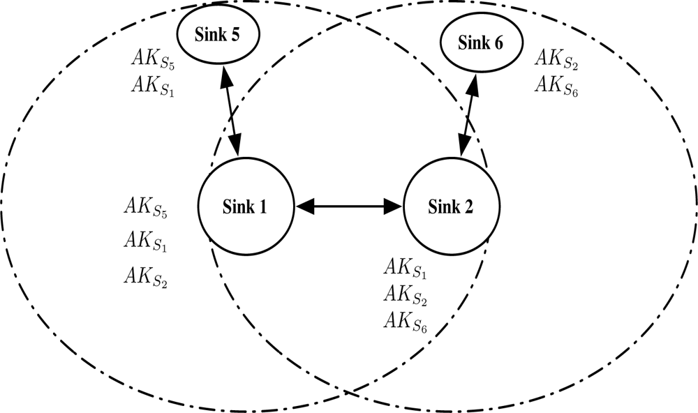 The “Authentication Ticket” is used for the node re-authentication. When a node requests authentication to a sink, the sink generates the authentication ticket and sends it to the node. The authentication ticket can be verified by the authentication key that is given to the neighbor sinks. Using the authentication ticket, the node movement is untraceable. Verification of the authentication ticket is available to neighbor sinks of the sink that issued the ticket. We adopt the idea of “cluster key” in [16] that shared to neighbor sinks. The main difference is that the cluster key in [16] is used for broadcast communication in the cluster, while the key in our protocol is used for verifying the authentication ticket. Thus, we rename the key as “authentication key” because of its different use in the protocol. Figure 7 shows that neighbor sinks of Sink 1 (S1) shares the authentication key AKS1.