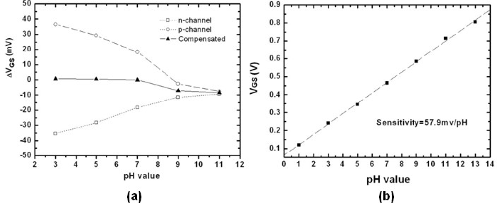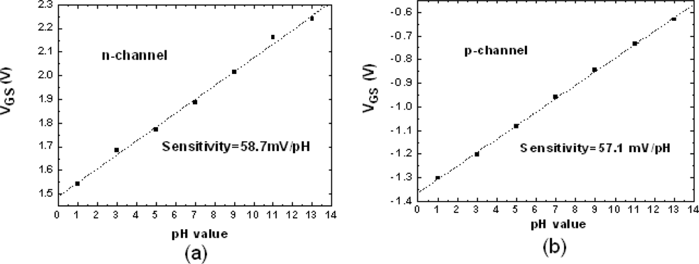 Figure 7 shows the schematic diagram of the proposed system and measurement method. The n-channel and p-channel ISFETs can be easily co-fabricated on the same wafer by the standard CMOS processes. While the applied biasing voltage was positive, the n-channel ISFET operated in the linear mode as sensing component and the p-channel ISFET was in cut-off mode. The sensing performances were mainly determined by n-channel ZrO2 gate ISFET and the altered threshold voltages should be read out. Similarly, the altered threshold voltages for p-channel ISFETs also should be read out while applying negative biasing voltage. Post signal processing would take the average for both outputs.