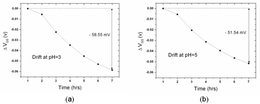 The drift rate of (a) n-channel ISFET and (b) p-channel ISFET for the first seven hours.