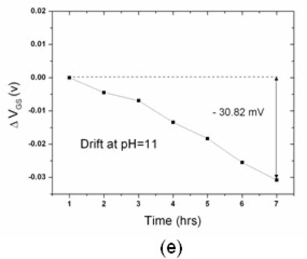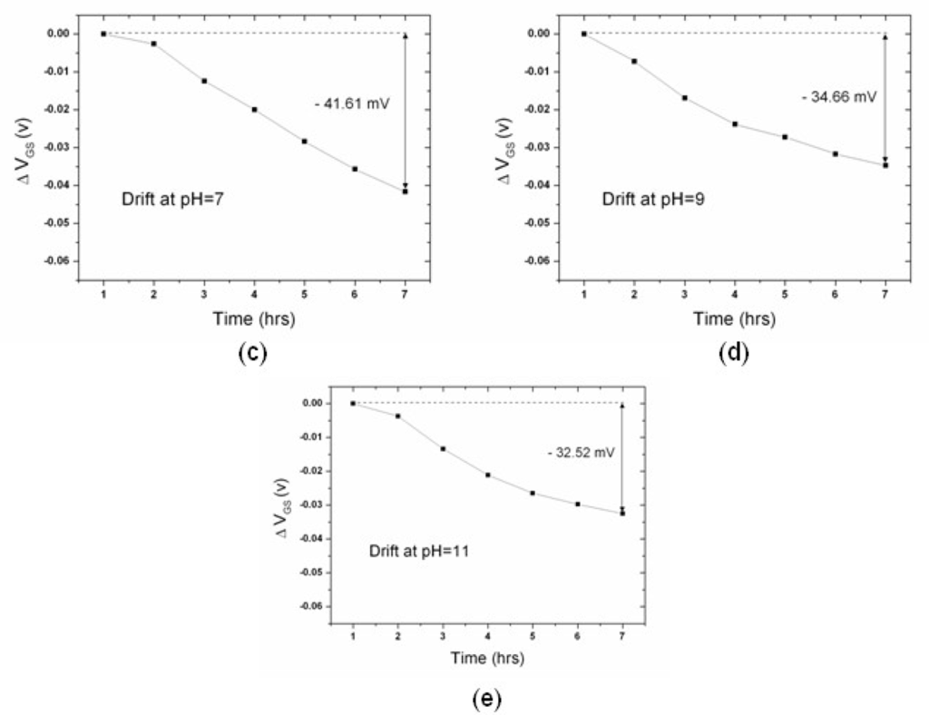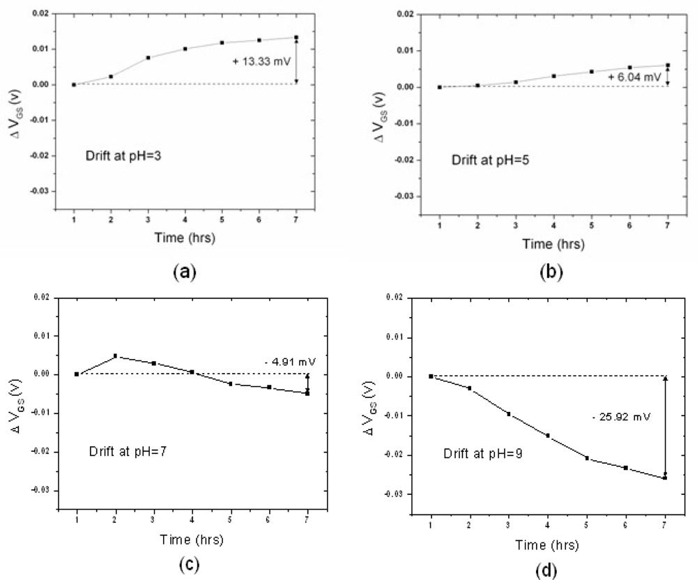 In this work, the trends of the pH-dependent threshold voltage differences were mainly attributed to the overall charge of (QD + QI + Qinv). Both QD and Qinv are determined by the nature of the device and are nearly a constant amount under fixed operating conditions. Hence, the pH-dependent drift will be primarily governed by the amount of QI in this work. The electrical biasing voltage is a direct effect, which drives in or pulls out the surface and beneath charges of sensing layer, with the result that the effective electrolyte-insulator surface charges density alteres and therefore the threshold voltage changes. Accordingly, the pH-dependent drift can be described as follows: