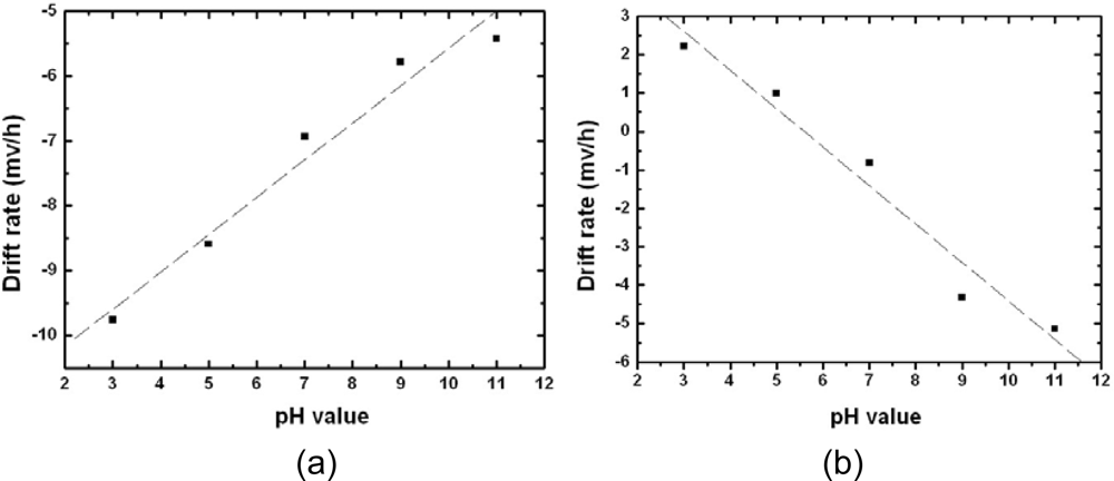 According to the studies of Chou et al. [10–14], the pH-independent and pH-dependent drift behaviors were observed on the ISFETs fabricated with different sensing materials and processes, such as hydrogenated amorphous silicon, tin oxide, amorphous tungsten oxide and AlN, etc. The pH-independent drift was defined as that the measured potential difference over a period of time in which the ISFET was immersed in the buffer solution of fixed pH value. Proposed solutions to improve pH-independent drift includes the specially designed compensative readout circuits [15], the new device structure with metal oxide as gate contact [16] and the choices of proper sensing films to suppress the influence of the pH-independent drift [17–19]. However, a promising method to deal with the pH-dependent drift has not been available up to date. The pH-dependent drift is obtained by measuring sensors under different pH values buffer solutions and its behavior is quite different from pH-independent drift because of its non-constant characteristics in different pH value electrolytes.