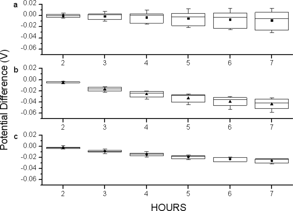 The charts of variations of the drift measured at different pH values from the second to seventh hour for (a) p-channel (b) n-channel ISFETs and (c) the compensation method. The box charts were calculated with the data measured from pH 3–pH 11 at different hours.