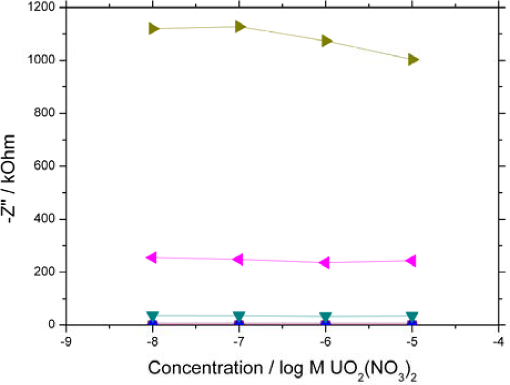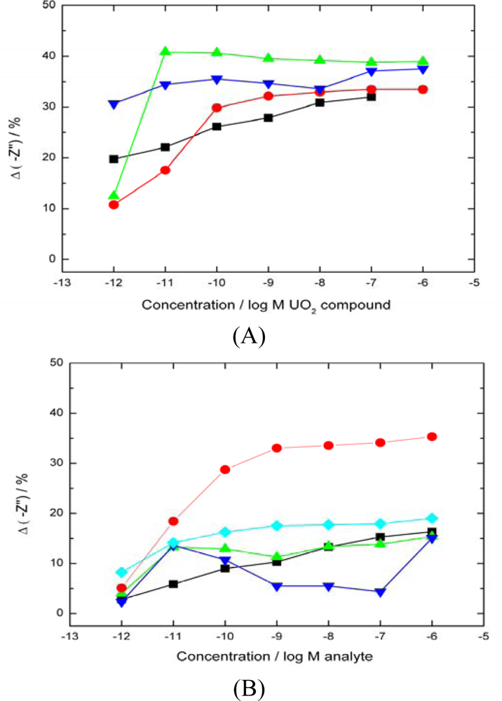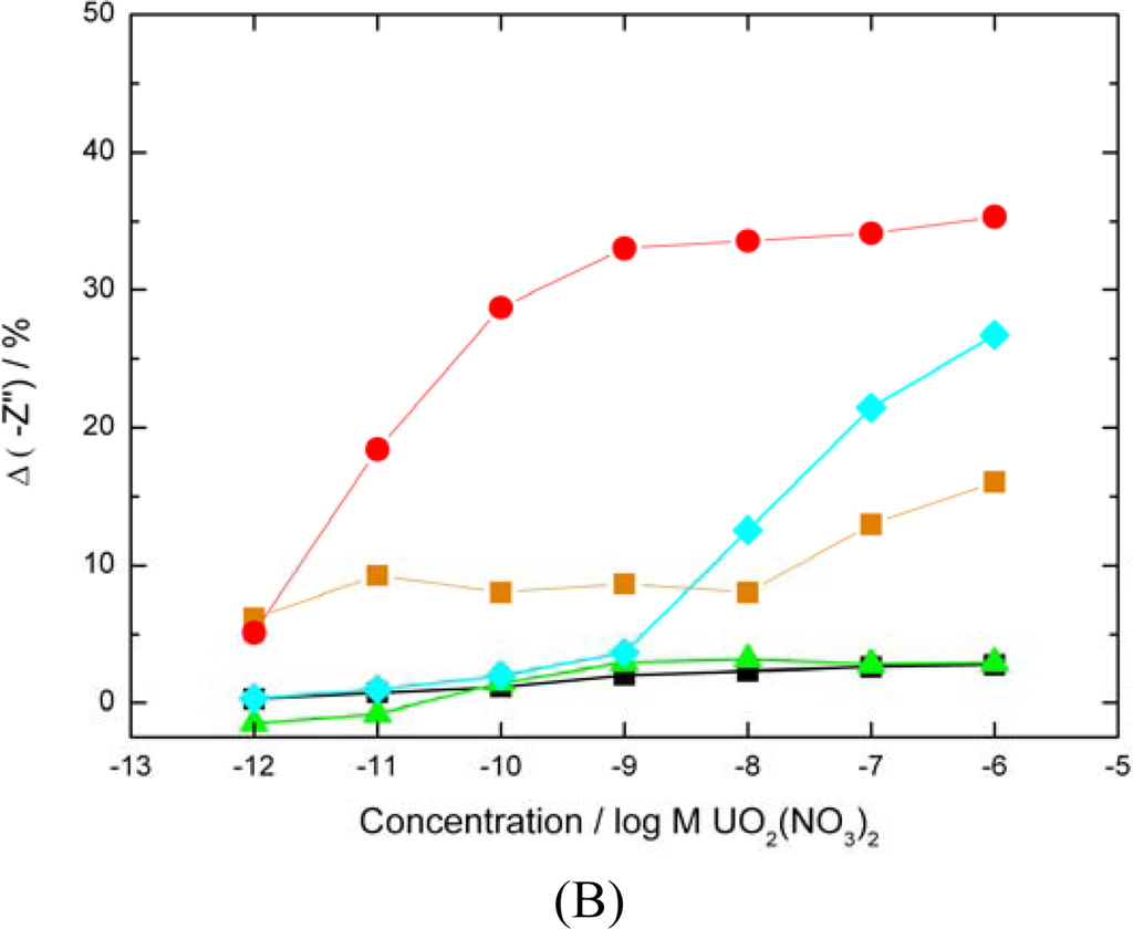 average uranyl response of SLP biosensor for comparison). The percentage decrease in –Z” was calculated as previously. Sequential analyte injections were performed over a 6 hours period. (▪ A control sensor with no analyte added showed only a 2% drift in base signal over the same period). (B) Modified SLP protein response to UO22+ (