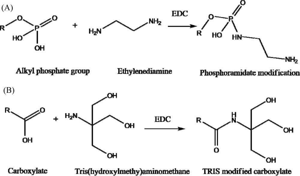 ) chemical modification of phosphate and carboxylate groups. The data show a 30.2% carbon C 1s to gold 4f peak ratio increase confirming successful modification of analyte binding sites.