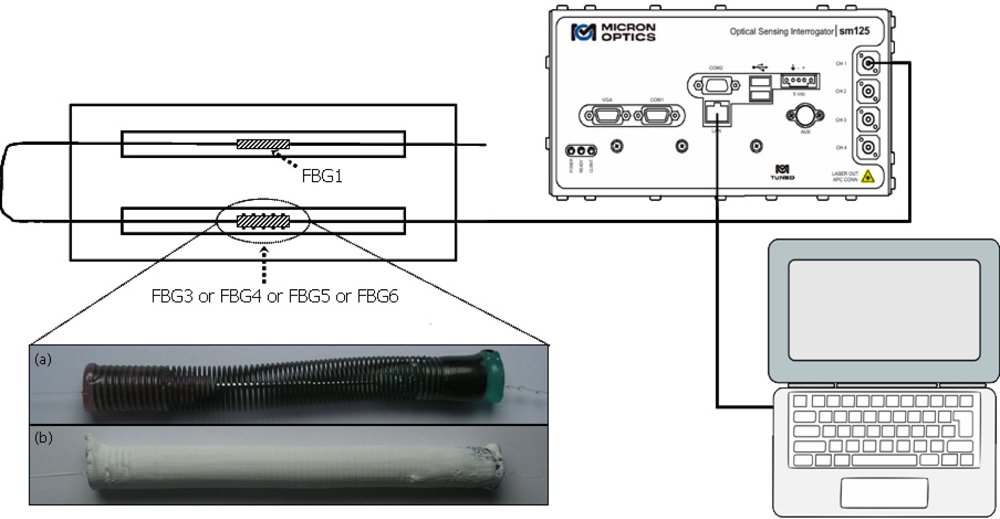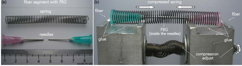 For the FBG packaging, two metallic needles of injection syringes with diameters of 0.80 mm and 1.20 mm were used—one put inside the other—and placed inside a spring. The wire diameter of the spring is 0.45 mm, while the spring diameter is 7.00 mm, resulting in an elastic constant of 1.0 N/m. In Figure 1(a), the elements used to build the sensor head are shown in scale. In the next step, the fiber with the FBG was inserted into the needles; after that the whole set was adjusted to the device responsible for compressing the spring, Figure 1(b). Then, the optical fiber and the spring were glued with cyanoacrylate to the plastic extremities of the needles. After the drying, the spring is released, subjecting the FBG to an initial strain.