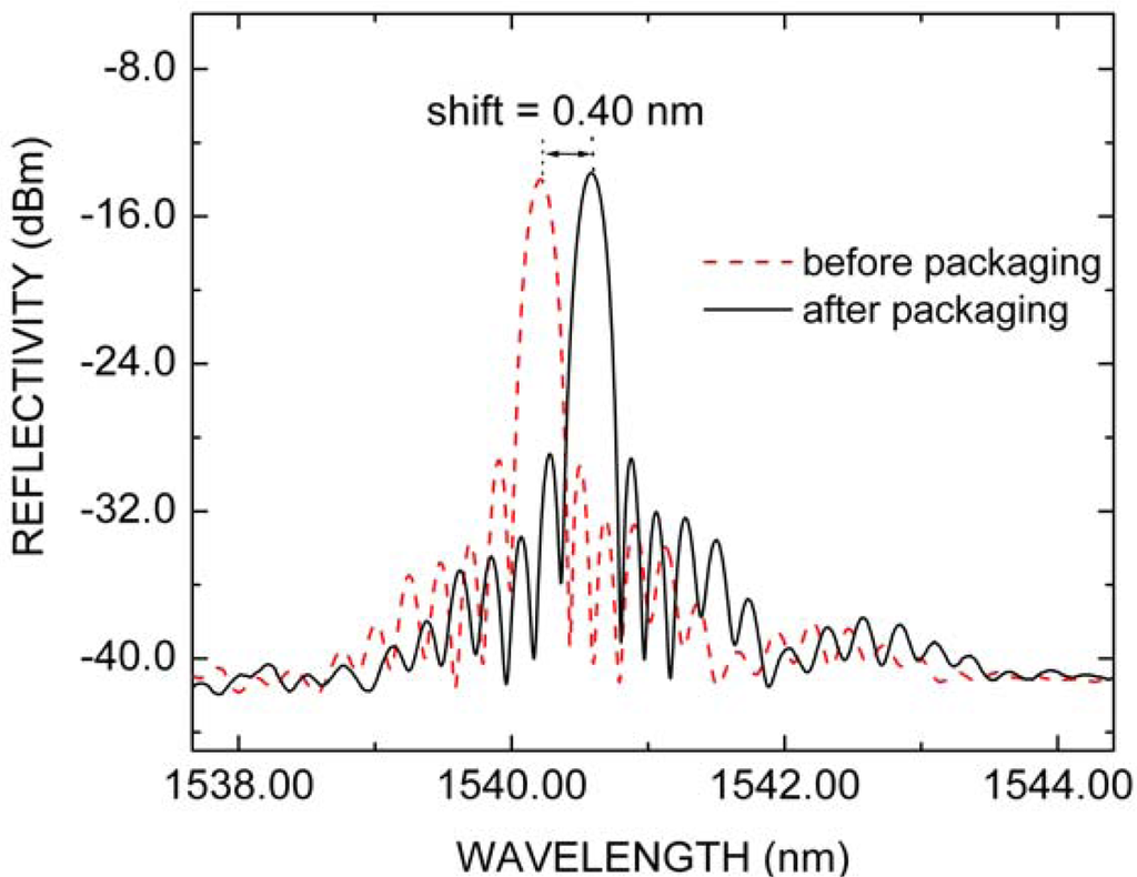 FBG2 reflection spectrum before (red dashed line) and after (black solid line) packaging.