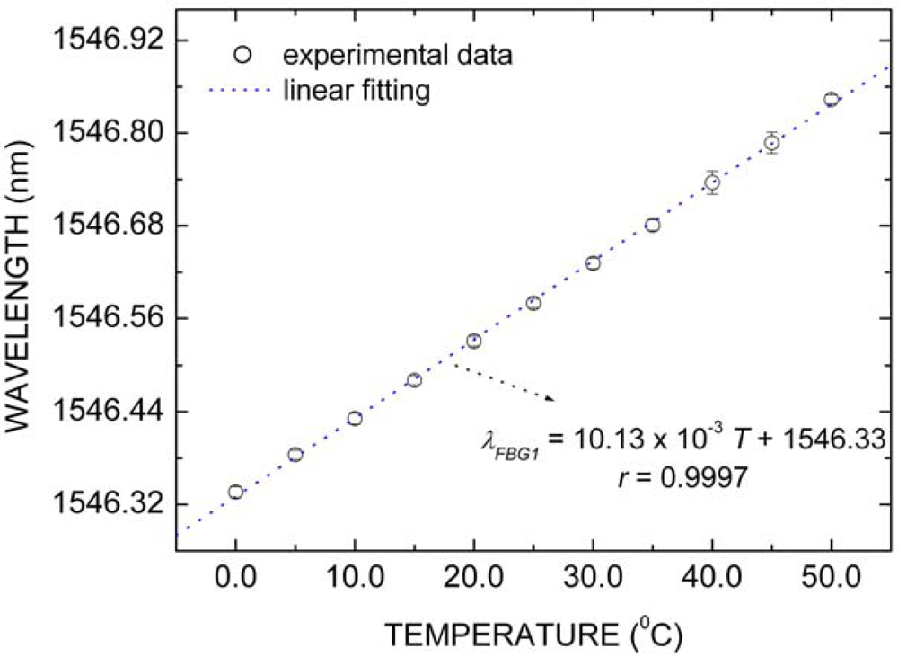 The FBG1, with Bragg wavelength of 1,546.53 nm at 20.0 °C, was selected only for temperature measurement. For this purpose, the FBG1 thermal response curve was determined using a Peltier cell monitored by type K thermocouple with resolution of 0.1 °C. The Bragg wavelength position was determined for the range between 0.0 °C and 50.0 °C in steps of 5.0 °C.