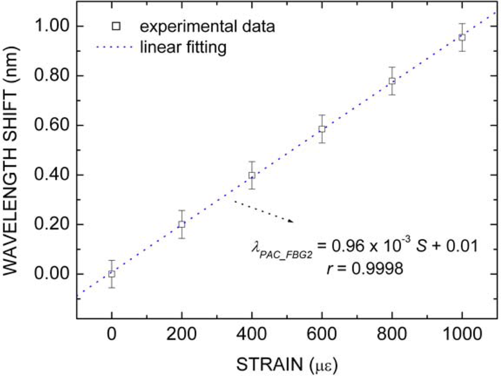 Figure 5 depicts the packaged FBG2 wavelength shift (λPAC_FBG2) in terms only of strain (S) changes. A linear relationship between the sensor wavelength shift and the strain variation is also observed. From the linear fitting to experimental data, a strain sensitivity of 0.96 ± 0.07 pm/με was obtained. The same procedure used to estimate the temperature uncertainty in Figure 4 was employed to estimate the combined uncertainty in the strain sensitivity in Figure 5. In this case, for Type B uncertainty, the linear translation stage resolution was considered to be 100 με. As was justified and described above, we also expect quite similar strain sensitivity for all packaged FBG.