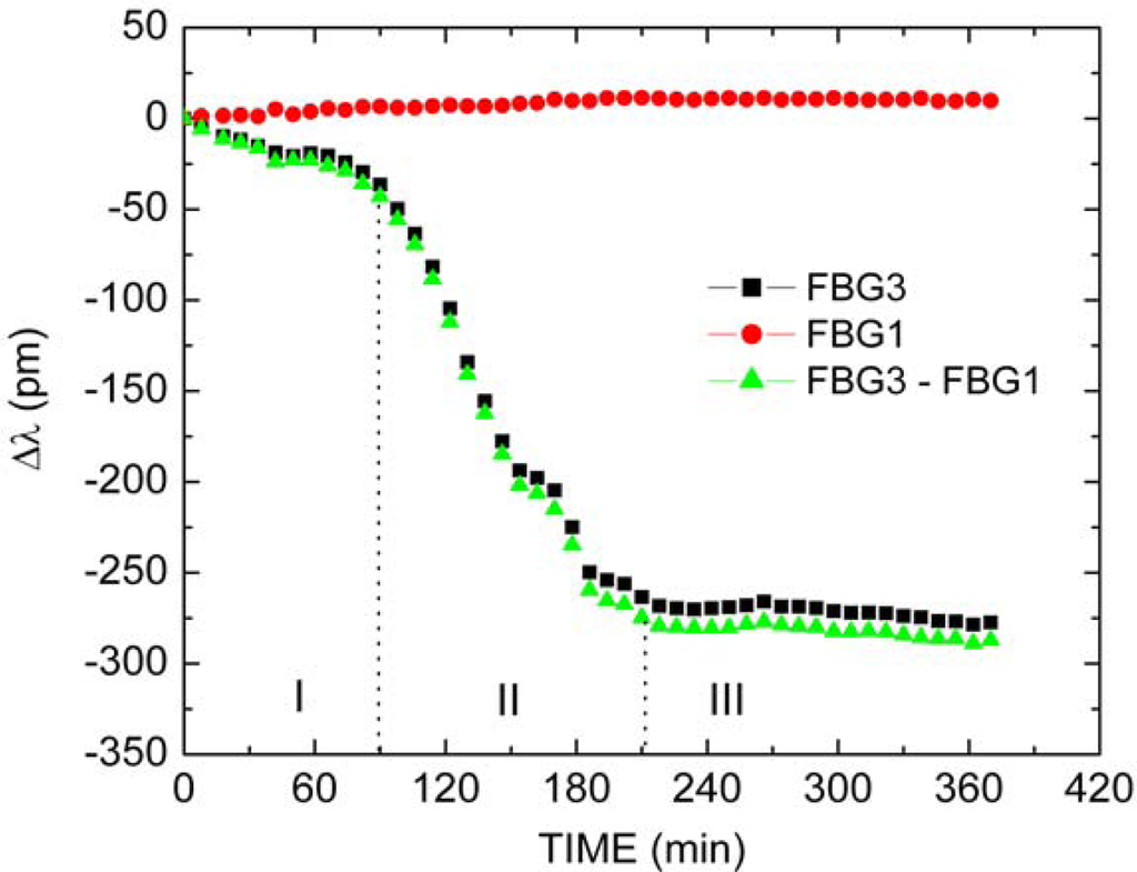 ). The spectral behavior of packaged sensor for temperature variations was compared with the spectral behavior of loose FBG1, as well as with the spectral behavior of packaged sensor with a layer of dry paint, under the same temperature changes (∼1.5 C). This procedure allows accessing the influence of the materials with different thermal expansion coefficients involved in the experiment in the thermally-induced Bragg wavelength shifts. For the three situations, the same temporal pattern was observed, however with differences in the wavelength shifts magnitudes. The maximum difference in the wavelength shift observed between packaged and loose FBG was ∼16 pm, this difference decreased to ∼5 pm when the paint applied to the sensor becomes dry. Although the observed thermal sensitivities are different, the magnitude of such observed wavelength shifts are small when compared with the magnitude of wavelength shifts observed as the drying process evolves (∼300 pm). Consequently, under the temperature controlled conditions employed during the experiments, the thermal behavior of loose FBG1 can be used to provide small corrections due to temperature fluctuations. Data in Figures 6, 7 and 8 are presented in time intervals of about 10 minutes just to make the graphs clear, in spite of the fact that they were measured in time intervals of 1 minute.