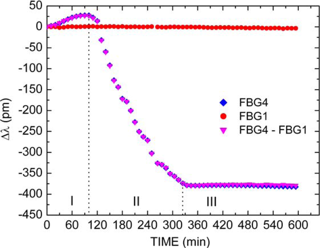 The compensated FBG3 response shows that during the Paint1 drying process there are, mainly, contraction effects. Three stages (I, II, and III) with distinct temporal behaviors can be identified during the drying process. In the Stage I, which occurs during approximately the first 80 minutes, a total wavelength shift of approximately 35 pm is observed. In this stage, the paint contraction is probably associated with water evaporation. This increases the paint density until the particles begin to get in contact with each other. In the Stage II, which lasts 130 minutes, a stronger and more complex mechanical deformation is observed, resulting in a total wavelength shift of approximately 245 pm. In this stage, stresses in the film deform the particles leading them into irreversible contact. The process of water evaporation remains, but the overall rate of evaporation decreases during this stage. Finally, in the Stage III, which initiates after 210 minutes from the beginning of the experiment, there is a total shift of 10 pm and, therefore, a less significant mechanical deformation takes place. During this stage, there is an inter-diffusion of polymer chains and the film develops its final characteristics. It is observed that at the end of drying process, the total FBG3 wavelength suffers blue shift of 290 pm, corresponding to a decrease of approximately 302 με in the initial strain applied to the grating by the spring, which relates to a final contraction of about 15 μm in the longitudinal film dimension (or equivalently 0.03%). No cracking was observed in the film after the 370 minutes. As the paint thickness will affect the coating drying time, non-uniformities along the paint layer on the sensor head can lead to different localized drying behaviors along the spring. However, as the experiment supplies an averaged measurement along the entire spring, such non-uniformities in the paint thickness may appear solely as a secondary effect in the FBG spectrum.