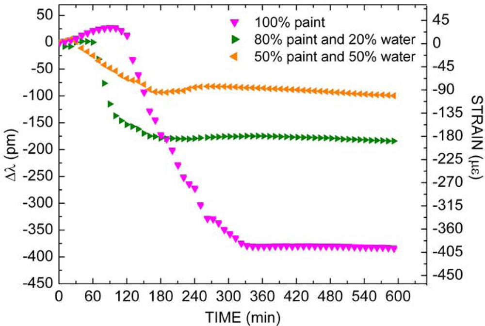)were investigated. For dilute paints, as in pure paint, three stages with distinct temporal behaviors were also observed. Initially, there are expansion effects denoted by a blue wavelength shift that occurs during, approximately, 30 minutes for paint concentration of 50% and during, approximately, 60 minutes for paint concentration of 80%. The magnitude of expansion effects observed in diluted paint is less important than in undiluted paint: the lower the amount of paint and the smaller the number of voids diminishes, consequently, the magnitude of mechanical expansion.Following further, there are contraction effects that are indicated by red wavelength shifts. These stages occur in the last 150 minutes and 120 minutes for concentrations of 50% and 80% of paint in the mixture, respectively. For paint concentration of 50%, a total wavelength shift of approximately 100 pm occurs corresponding to a contraction of 104 με. For paint concentration of 80% a total wavelength shift of approximately 200 pm was measured, corresponding to a contraction of 208 με. For both diluted paint, the dry-through time is approximately 170 minutes less than undiluted paint. Therefore, the increase in the water ratio mixed into the paint decreases the mechanical deformation magnitude and also decreases the time in which the mechanical deformation ceases (Stage III). Here, the smaller amount of paint in the samples also plays an important role in the contraction effects during drying process, modifying the time when deformation ceases. As the proportion of water in the paint increases, the rate of water evaporation also increases, decreasing the extent of Stage I. The smaller contraction observed along Stage II for increasing amounts of water reflects a less effective interaction between the paint constituents, once the reduction in the time interval for film formation inhibits the paint particles to effectively get in touch with one another.