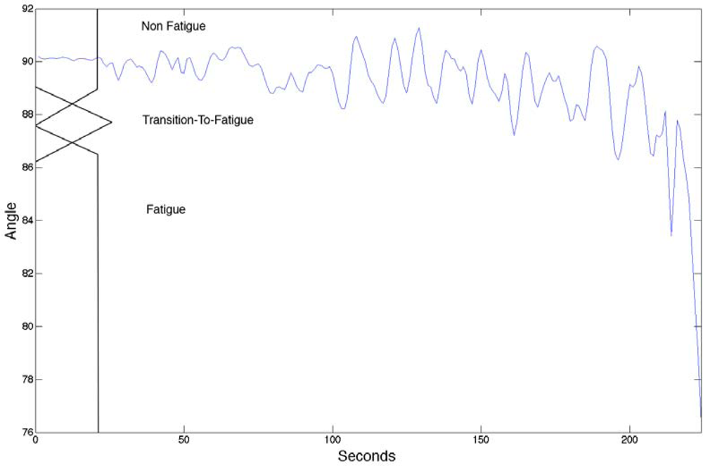 - Figure 1 indicates the fuzzy set input for the elbow angle provided by the Goniometer (0 to 180 degrees): Angles above 89 indicates Non-Fatigue, angles below below 86.5° indicates Fatigue and any angle between 86.5° to 89° boundaries are considered Transition-to-Fatigue. The figure also has a superimposed illustration of a single Goniometer trial signal giving an example of how the fuzzy classifier is finding the boundaries to enable the labeling of the sEMG signal.