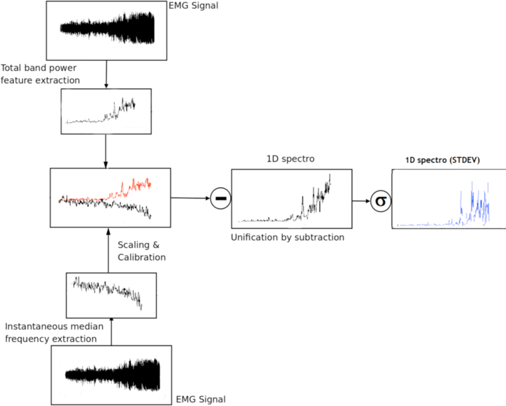 As mentioned above, the 1D spectro_std was developed in this study to assist in the prediction and detection of muscle fatigue and was built on a previous study that predicted the onset of Transition-to-Fatigue class using the feature 1D Spectro [16]. In that study the instantaneous median frequency and the total band power are unified. The novel feature in this research was produced by using the standard deviation of the unified signal which we named 1D spectro_std. The name of this feature was inspired by the spectrogram. The spectrogram shows the spectral density over time usually using a two- dimensional image, while the 1D spectro reduces the dimensionality to one. This is accomplished when the two feature signals are unified (total band power and instantaneous median frequency) by subtraction. Due to the simplicity and powerful analysis capabilities, the 1D spectro_std can be easily embedded in a mobile wearable muscle fatigue system while retaining exceptional classification performance. Figure 3 shows a graphical representation of how the updated 1D spectro forms the 1D spectro_std. The latter is used in this study to detect the onset of Transition-to-Fatigue and the onset of Fatigue.