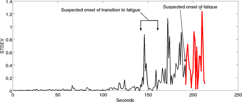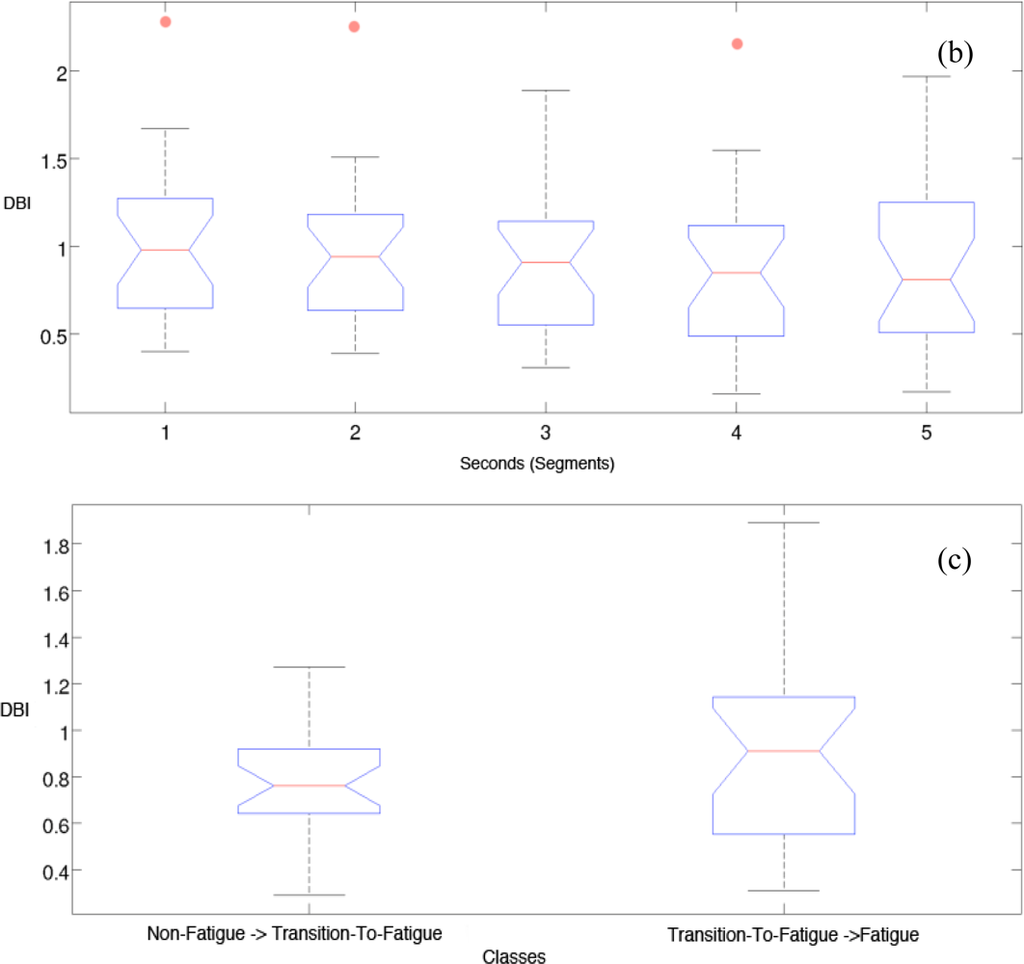 Figure 5(a) shows the initial results of the DBI for Non-Fatigue and Transition-to-Fatigue. It can be seen that when we use more than one second the separation improves, thus improving the classification in later stages. It was chosen in this study to use a three second segment of standard deviation to improve performance while keeping the system sensitive when used in realistic scenarios.