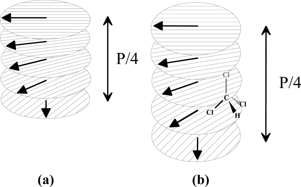 In all these sensing materials, cholesteric liquid crystals (CLCs) [14–19] provide a different sensing approach for polar solvent vapours in comparison to others, particularly for non polar ones that possesses low reactivity for chemical interactions. CLCs are also referred to as chiral nematic liquid crystals because they form helical patterned layers over each other that exhibit chirality. There is a certain periodic variation in the patterning of these helical layers which is recognized as pitch of CLCs, i.e., equal to the distance covered to make a complete rotation of 360°. The incorporation of analyte vapours in CLCs helical layers tends to change the pitch and that ultimately alter the optical properties. This feature of CLCs could prove beneficial for organic vapour detection as the incorporation of analyte molecules changes the anisotropic phase of CLC. The nature of the interaction between analyte vapours and CLCs is attributed to short range attractive forces similar to those present between helical layers. The application of CLCs [20] for aromatic and halogenated solvent vapours sensing by using mixture of cholesteric esters has already been reported. The suitable selection of different cholesteric esters combinations had proven very effective to tune the optical properties of sensing material. These studies also provide the information about humidity effect and temperature dependence on absorbance of organic vapours detection by CLCs.
