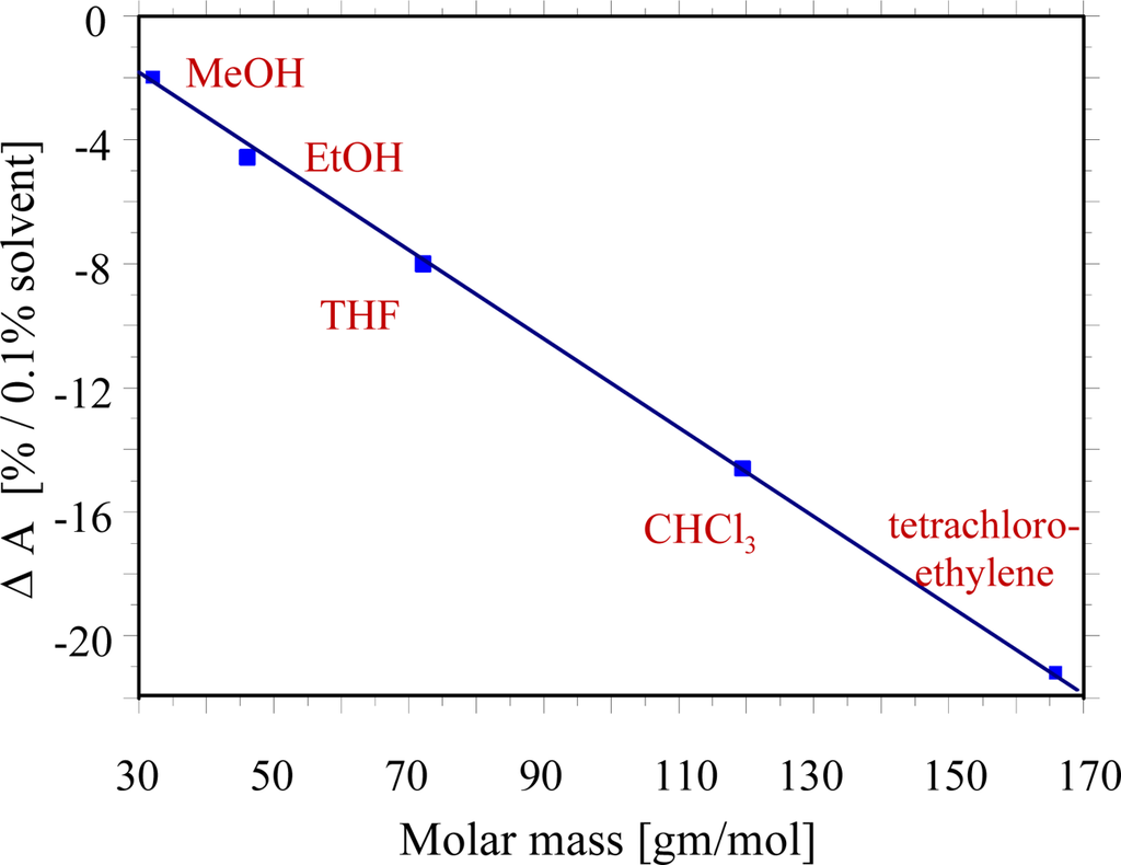 With a mixture of chiral biphenyls (Licritherm TM 1013, Merck AG) as sensitive material, analytes can be detected down to a few ppm. The dotted curve in Figure 2 shows the VIS-spectrum of a mixture with a maximum absorbance at 553 nm at 20 °C. When the LC is exposed to an increasing vapour concentration of polar or halogenated solvents a shift of the absorption band towards smaller wavelengths occurs. The effect, which is fully reversible, has been demonstrated in Figure 2 for an increasing tetrahydrofuran (THF) concentration in air up to 1.0%. The optical changes of the layers can be characterized by absorbance shifts when the wavelength of observation is fixed. The sensor characteristics were studied on various other solvents, such as methanol, ethanol and the environmental toxins such as chloroform and tetrachloroethylene, and a linear relationship between analyte concentration and absorbance is evident. The cholesteric material is able to discriminate between different solvents and offers a way for molecular shape recognition. The linear correlation between the shift of absorbance ΔA and the molar mass of the solvent as demonstrated in Figure 3. It indicates that the weight and shape of incorporated analyte vapours influence the pitch of anisotropic phase and thus changing its optical properties directly.