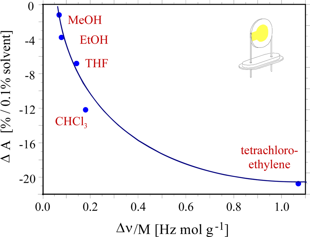 To examine the incorporation of analytes by the sensitive layer, further mass-sensitive measurements were performed. Here the liquid crystal mixture served as sensitive coating material on a 10 MHz QMB resonator and the device was exposed to an environment with an increasing solvent vapour concentration. In Figure 4 the optical absorption as a function of change in frequency, i.e., mass-normalized sensor response Smass = Δν/Msolvent is described. The term normalized response (Smass) is defined as ratio between frequency shift Δν at 1,000 ppm solvent concentration and the molar mass of the analyte Msolvent to eliminate the pure weight effect.
