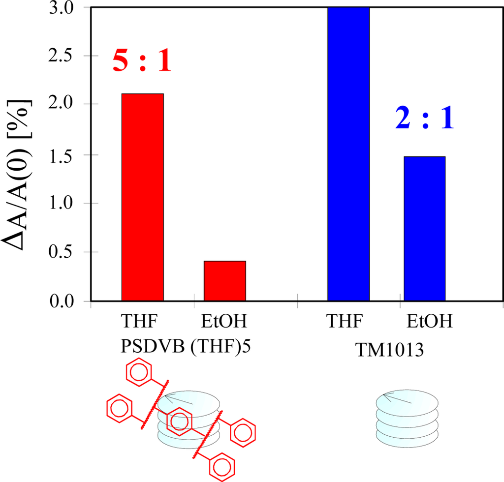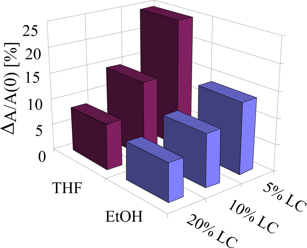 To improve the stability of the LC-coating against mechanical flooding, the cholesteric phase was embedded into a polystyrene matrix. In order to generate robust and porous materials that still allow analyte diffusion in the polymer, divinylbenzene was added to a styrene monomer mixture as a cross-linker in an optimized amount of 30 vol.%. Further selectivity enhancement was performed by applying the technique of molecular imprinting. The polymerization reaction was initiated by AIBN. The latter evaporates during the polymerization process due to the heating of the reaction mixture and a rigid polymer coating adapted to the analyte of interest results. CLCs in the imprinted polymer matrix provide selectivity for solvent vapour detection, which was determined through an optical transduction scheme. It has been observed that the optical absorbance for THF used as template is twice that of ethanol when pure LCs were used as sensing material, while in the case of the imprinted polymer having embedded CLCs, the absorbance of THF is about five times higher than ethanol, which demonstrates the improved selectivity provided by the imprinting matrix. The cavities formed by molecular imprinting are template oriented and favour the re-inclusion of target analyte vapours. Figure 5 shows the difference between the pure LCs and in imprinted matrix (THF) for the same solvent vapours detection indicating that the imprinted system is much more selective than the pure material. CLCs were added in optimized amount in imprinted polymer to attain enhanced selectivity.