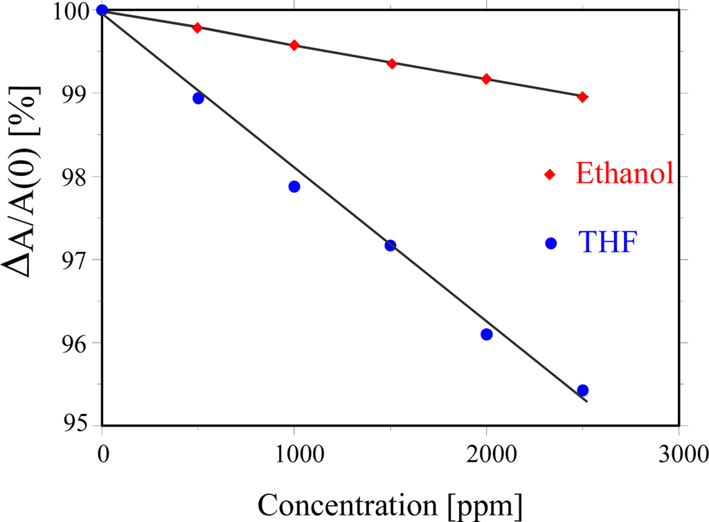 The imprinted LCs was put under examination and equal concentrations of THF and ethanol were exposed to them and the corresponding optical response was measured, as presented in Figure 7. It is evident from the graph that there is a linear sensor response for exposed THF and ethanol vapours. As a result the separation properties of the LC are effectively increased by the supporting effect of the imprinted matrix which is mass-shaped to the analyte of interest. In the measurements reported here the temperature dependence was avoided by thermostating the test gas as well as the optical cell with an integrated temperature control of the measuring equipment.