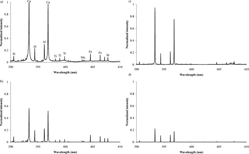 - Corsi, M.; Cristoforetti, G.; Hidalgo, M.; Iriarte, D.; Legnaioli, S.; Palleschi, V.; Salvetti, A.; Tognoni, E. Effect of laser-induced crater depth in laser-induced breakdown spectroscopy emission features. Appl. Spectrosc 2005, 59, 853–860. [Google Scholar]