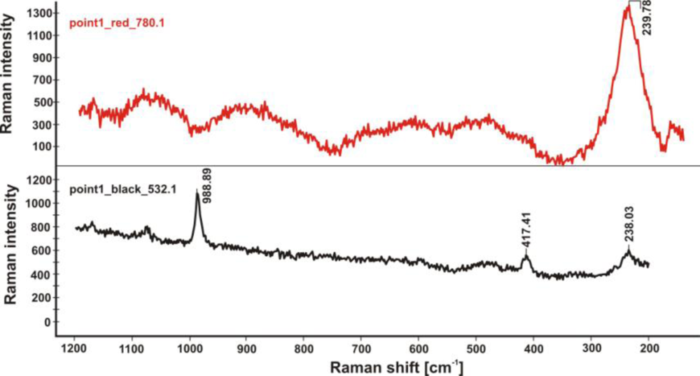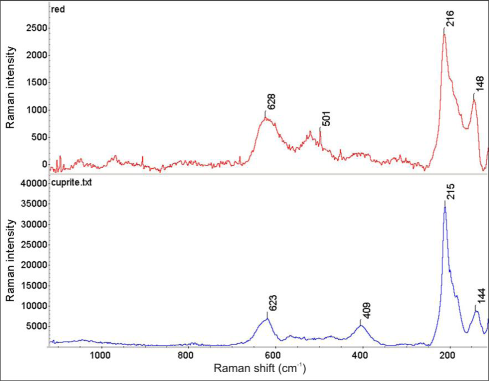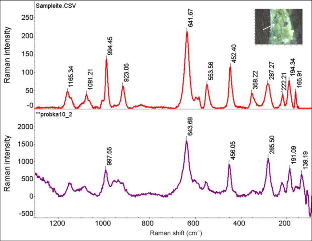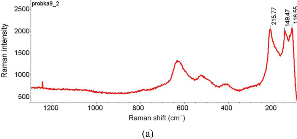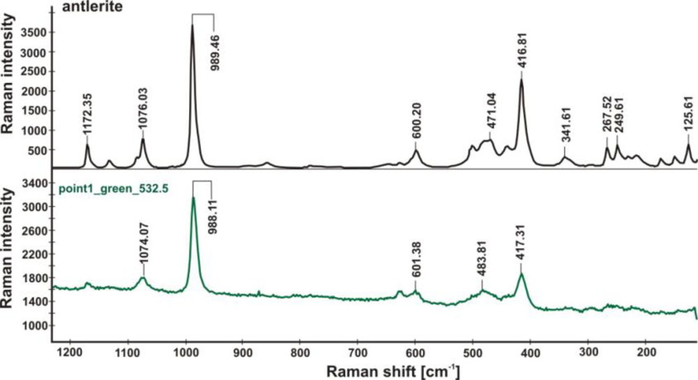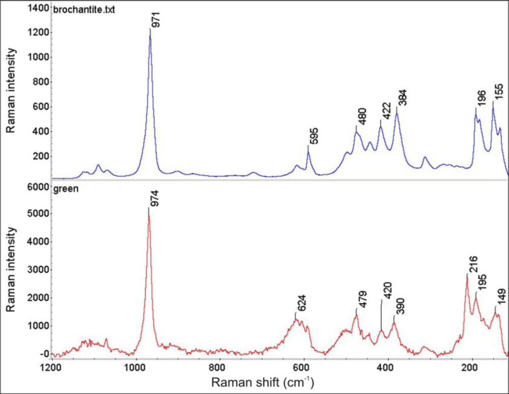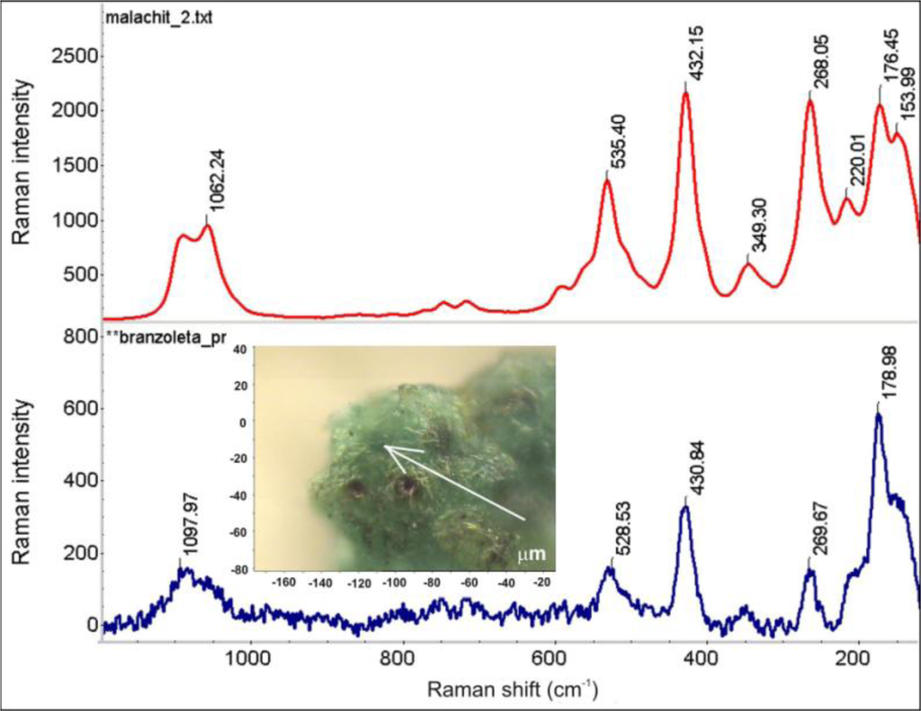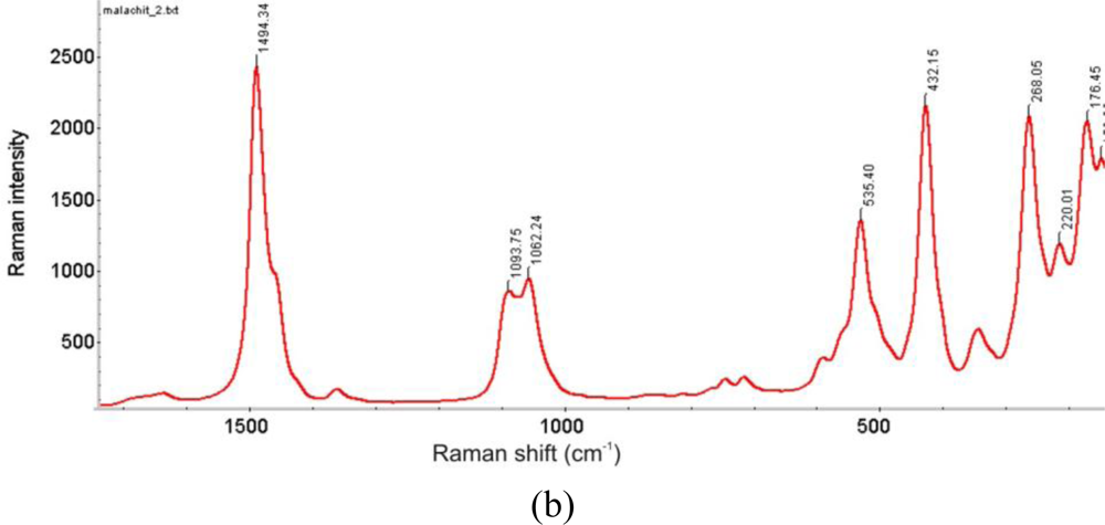 - Frost, R.L.; Martens, W.N.; Rintoul, L.; Mahmutagic, E.; Kloprogge, J.T. Raman spectroscopic study of azurite and malachite at 298 and 77 K. J. Raman Spectrosc 2002, 33, 252–259. [Google Scholar]