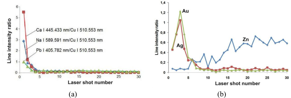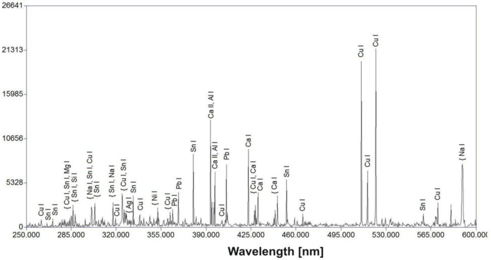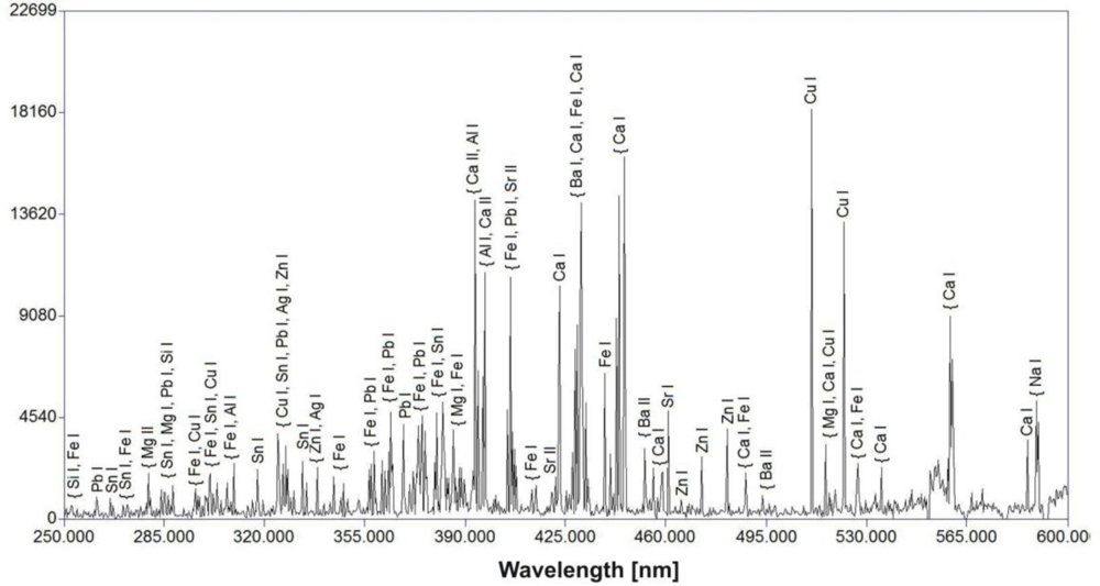 - De Giacomo, A.; Dell’Aglio, M.; De Pascale, O.; Gaudiuso, R.; Santagata, A.; Teghil, R. Laser Induced Breakdown Spectroscopy methodology for the analysis of copper-based-alloys used in ancient artworks. Spectrochim. Acta. B 2008, 63, 585–590. [Google Scholar]