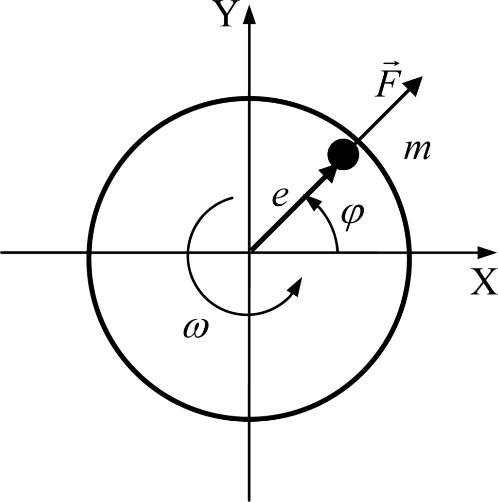 Figure 1 shows a diagram of a flat rotor and a point with mass m causing imbalance. The imbalance mass is also characterized by an eccentricity e to the rotor axial axis and angle φ. If the rotor has an angular velocity ω, the amplitude of the resultant force F and its components, Fx and Fy, due to the imbalance are calculated as [13]: