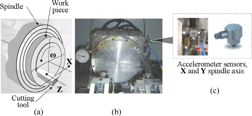 (a) A workpiece attached to the spindle and machine axes. (b) Ultra precision spindle model SP-150. (c) Piezoelectric accelerometer sensors model 352C15.