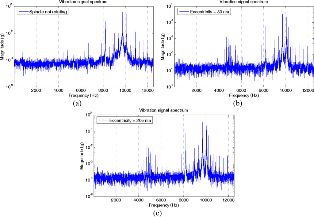 Magnitude spectra of the X-axis vibration signal. (a) Spindle not rotating. (b) Spindle rotating at 1000 r/min, eccentricity of 39 nm. (c) Spindle rotating at 1000 r/min, eccentricity of 205 nm.