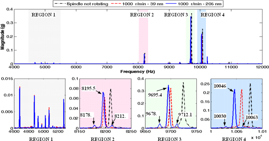 The spectra are quite similar at first glance, except in a region around 5 kHz where there are harmonics related to the rotation. New harmonics also appear near the frequency of the main harmonics. Figure 5 depicts the three analyzed cases and the spectrum expanded in four frequency regions. The first region corresponds to the harmonics close to 5 kHz and the other regions are related to the frequencies around the main harmonics of the spectrum, with the largest harmonic within the third region. As it is shown in regions 2, 3 and 4, there are two new sideband harmonic components for the signal collected with 205 nm in eccentricity that are not present in the other two spectra. In the case of the third region, these new harmonics and the main harmonic have a frequency of 9678.7, 9695.4 and 9712.1 Hz. The difference between them is just 16.7 Hz, which corresponds exactly to the spindle rotation frequency. In the regions 2 and 4, also appear new sideband harmonic components. Moreover, within the first expanded region, this event does not occur.
