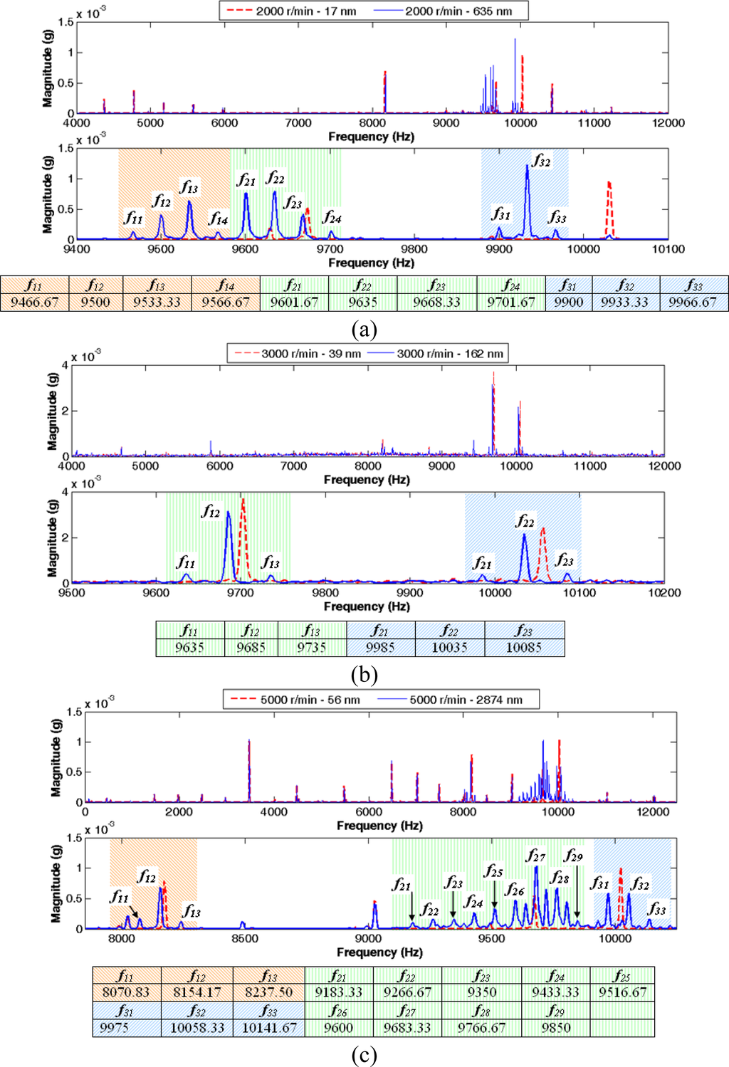 For a better understanding of the formulated hypothesis, Figure 6 illustrates six more cases of the vibration signal magnitude spectrum, three different rotation frequencies and two values of eccentricities: 33.33 Hz (2,000 r/min), eccentricities of 17 and 635 nm (Figure 6a); 50 Hz (3,000 r/min), 39 and 162 nm (Figure 6b) and a rotation frequency equals to 83.33 Hz (5,000 r/min), eccentricities values of 56 and 2874 nm (Figure 6c). For each rotation frequency, the figure depicts the spectrum at a frequencies range with the more relevant information and the spectrum expanded within a frequencies interval close to the main harmonics, showing in the case of the biggest eccentricity value, the harmonics sequences and the frequency of each component. According the figure, it can be verified that on each harmonics sequence the frequency difference between two consecutive harmonics is equal to the rotation frequency.