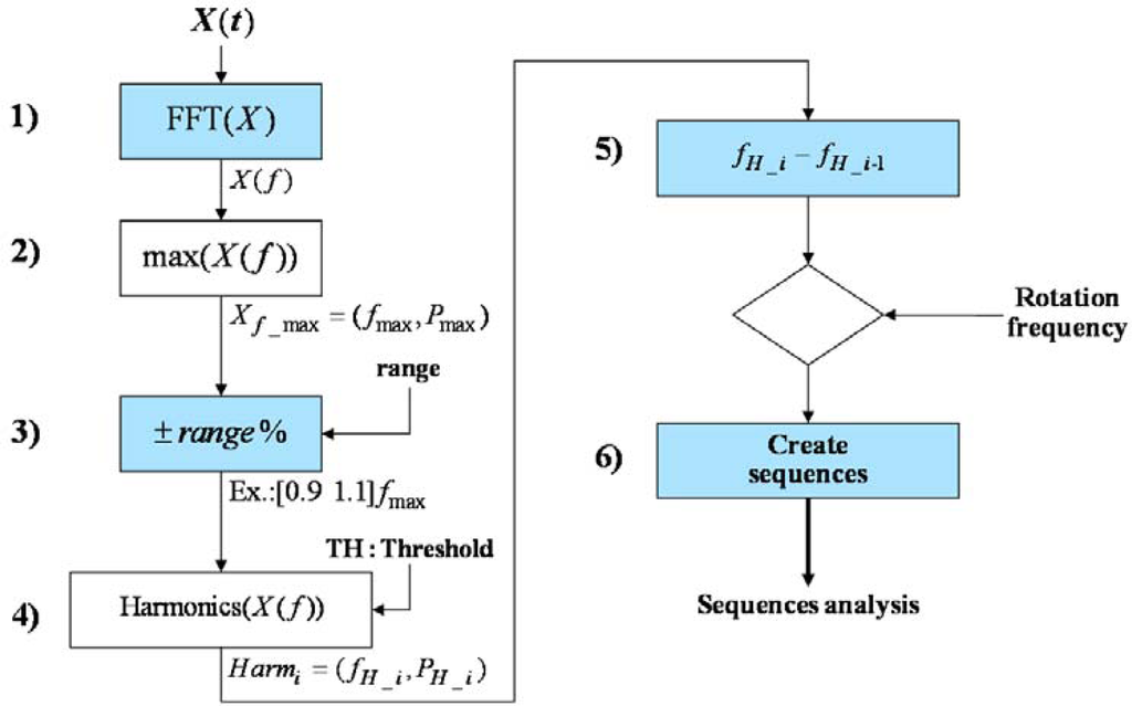 An algorithm to find sequences in the spectrum of the vibration signal is designed from the previous study and hypothesis. The main parameters of the algorithm are the rotation frequency of the device and the desired frequency search range. Figure 7 shows the block diagram of the developed algorithm.