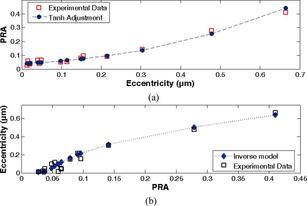 Experimental data and fitted curves, (a) direct model, PRA versus Eccentricity, (b) inverse model, Eccentricity versus PRA.
