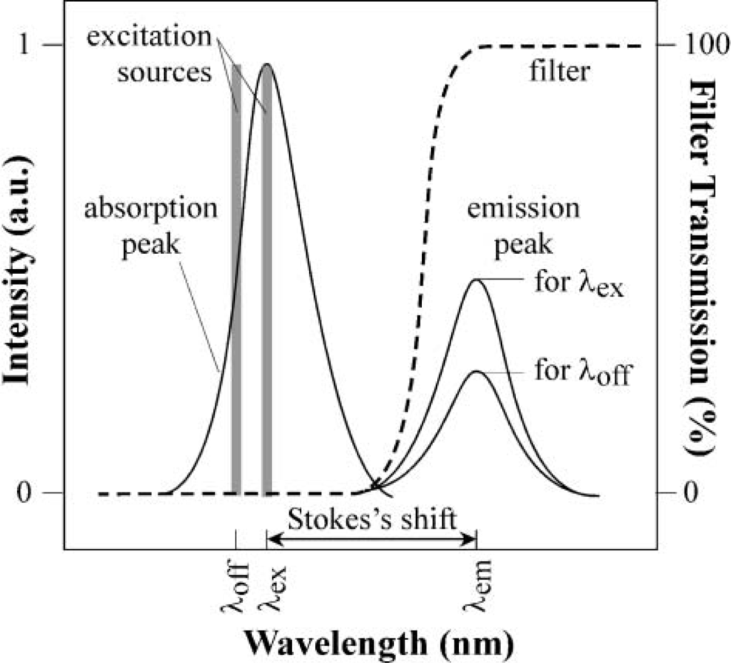 Typical peaks in the excitation (left) and emission (right) spectra, in arbitrary units. The wavelength filter (dashed line) must reject the excitation light and transmit the emitted fluorescent light. Excitation with off-peak (λoff) lowers the emission intensity.