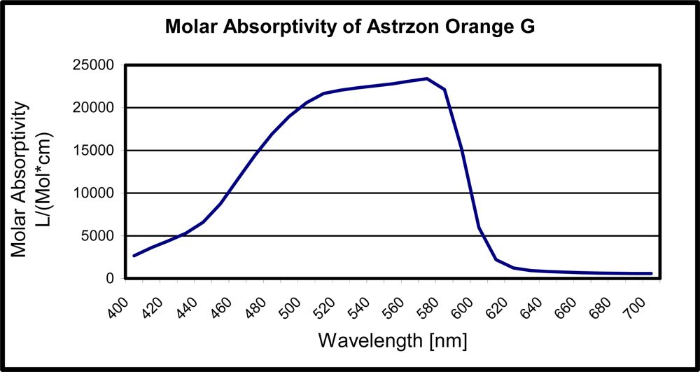 Molar Absorptivity of Astrazon Orange G dye as a function of wavelength.