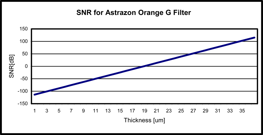The Astrazon Orange G dye dissolves best in the Ethyl-Alcohol solvent; we can achieve a concentration of 50 mg/ml. Any larger concentrations produce dye aggregation which will cause non-uniformity to the filter. To calculate the desired thickness of our filter we define SNR as the ratio of number of electrons produced from the fluorophore to the number of electrons produced due to excitation light in our CMOS sensor array for one pixel. To simplify calculation we assume the excitation light has a Gaussian profile (i.e., the transverse electric field and intensity distributions are described by Gaussian functions), the fluorophore is a point source with isotropic emission light and we neglect any optical path losses after the filter to the sensor array. Under these assumptions we can calculate the minimum filter’s thickness to give us the desired SNR.
