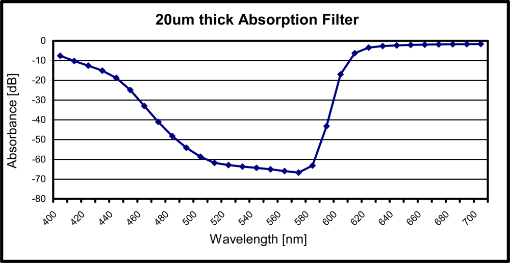 Using the calculations from above and Beer Lamberts law, the filters absorbance spectra can be derived as shown in Figure 5. The filter has max attenuation of −66 dB at 570 nm and minimum attenuation of −1.6 dB at 650 nm. With a roll-off of 20 nm the filter allows good contrast imaging and is suitable for low light fluorescence detection.