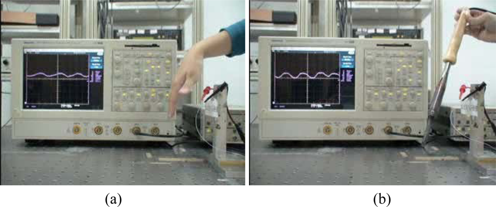 A demonstration of the flexible proximity sensor: A corresponding signal appears on the oscilloscope when (a) a shaking hand and (b) a hot welding gun approach the sensor.
