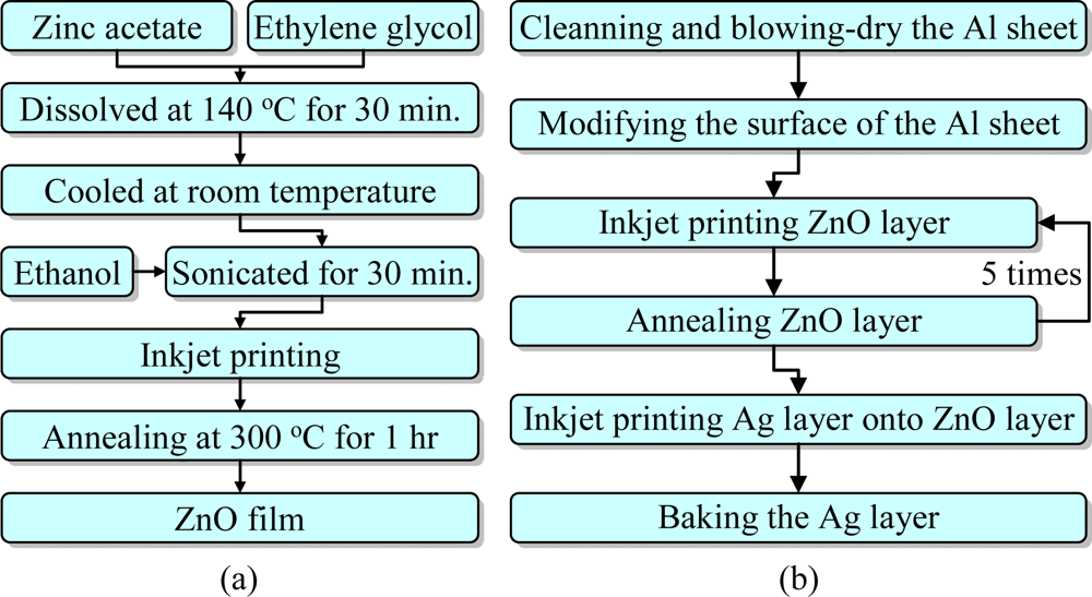 The ZnO inkjet solution is prepared by the sol-gel method, as shown in Figure 2(a). It is synthesized by dissolving 0.4 mol of zinc acetate into 120 mL ethylene glycol and heating at 140 °C for 30 min, which results in a transparent solution. However, the solution will settle after cooling at room temperature for about 30 minutes. Therefore 280 mL ethanol are add into the solution which is sonicated for 30 minutes until the sediment is completely dissolved in ethanol. Filtration of the solution affords a clear and homogeneous ZnO solution. Its molal concentration is 1 M, its viscosity is 14 CPS, its surface tension is 30 dynes/cm, and its pH value is 6. The inkjet material of the top electrode layer is a commercial alcohol-based nano-silver ink provided by Cabot Conductive Ink (CCI-300). Its viscosity and surface tension at room temperature are about 11–15 CPS and 30–33 mN/m respectively, the silver solids loading is about 19–21 wt%, and its density is about 19–21 g/mL.
